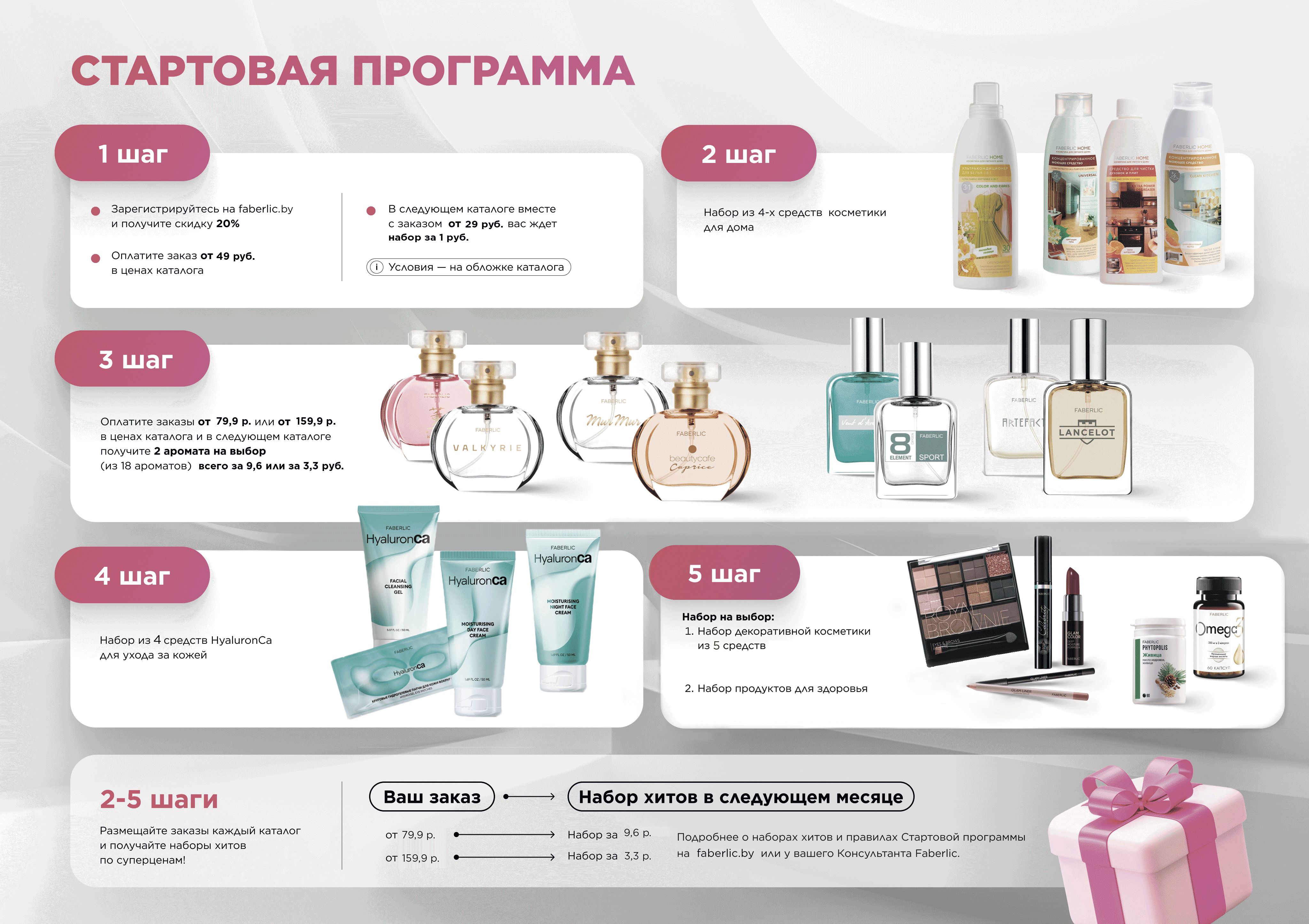 Участвуйте в Стартовой программе для новых покупателей и знакомьтесь с хитами Faberlic! 5 шагов Стартовой программы познакомят вас с лучшими продуктами и настоящими бестселлерами компании!