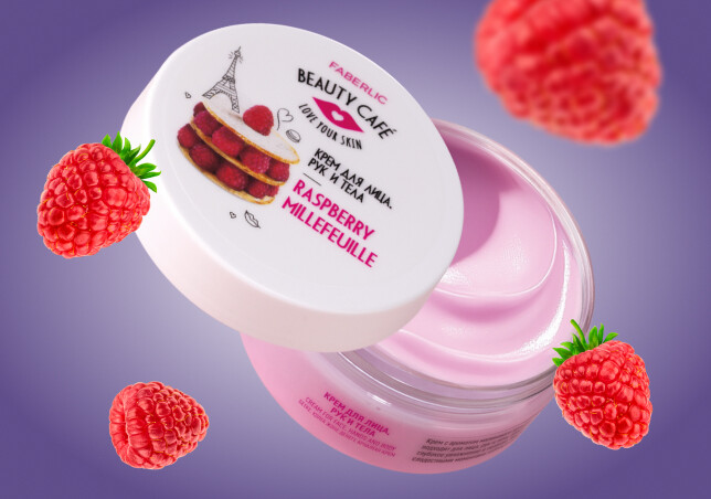 Raspberry Millefeuille Face, hand and body cream (12129) intensively cares for skin and envelops it in a delightful aroma.